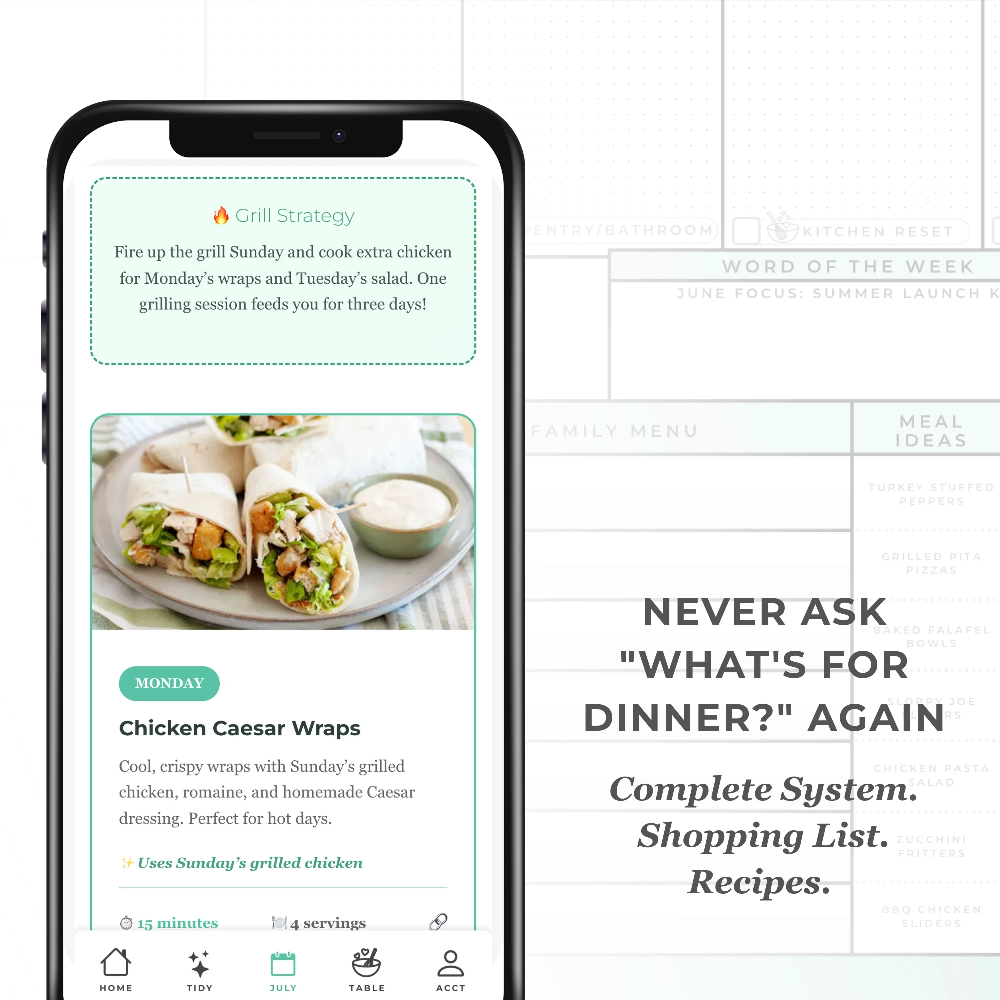 - Complete meal ideas listed directly on your calendar
